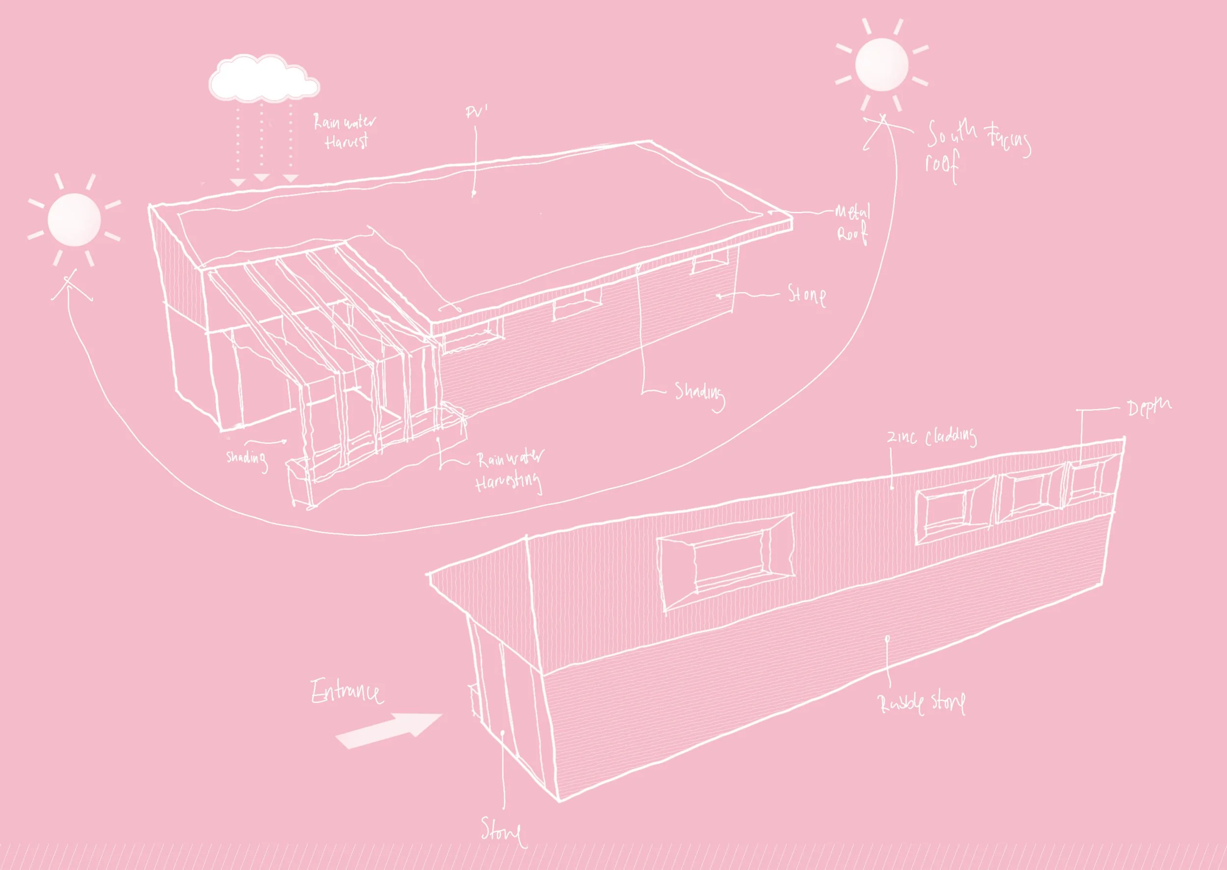 The design combines rubble stone base walls with a modern zinc-clad top section, creating a strong yet sensitive architectural language. Large windows offer natural light and views while maintaining privacy, and the highly insulated fabric ensures year-round comfort with minimal energy use.