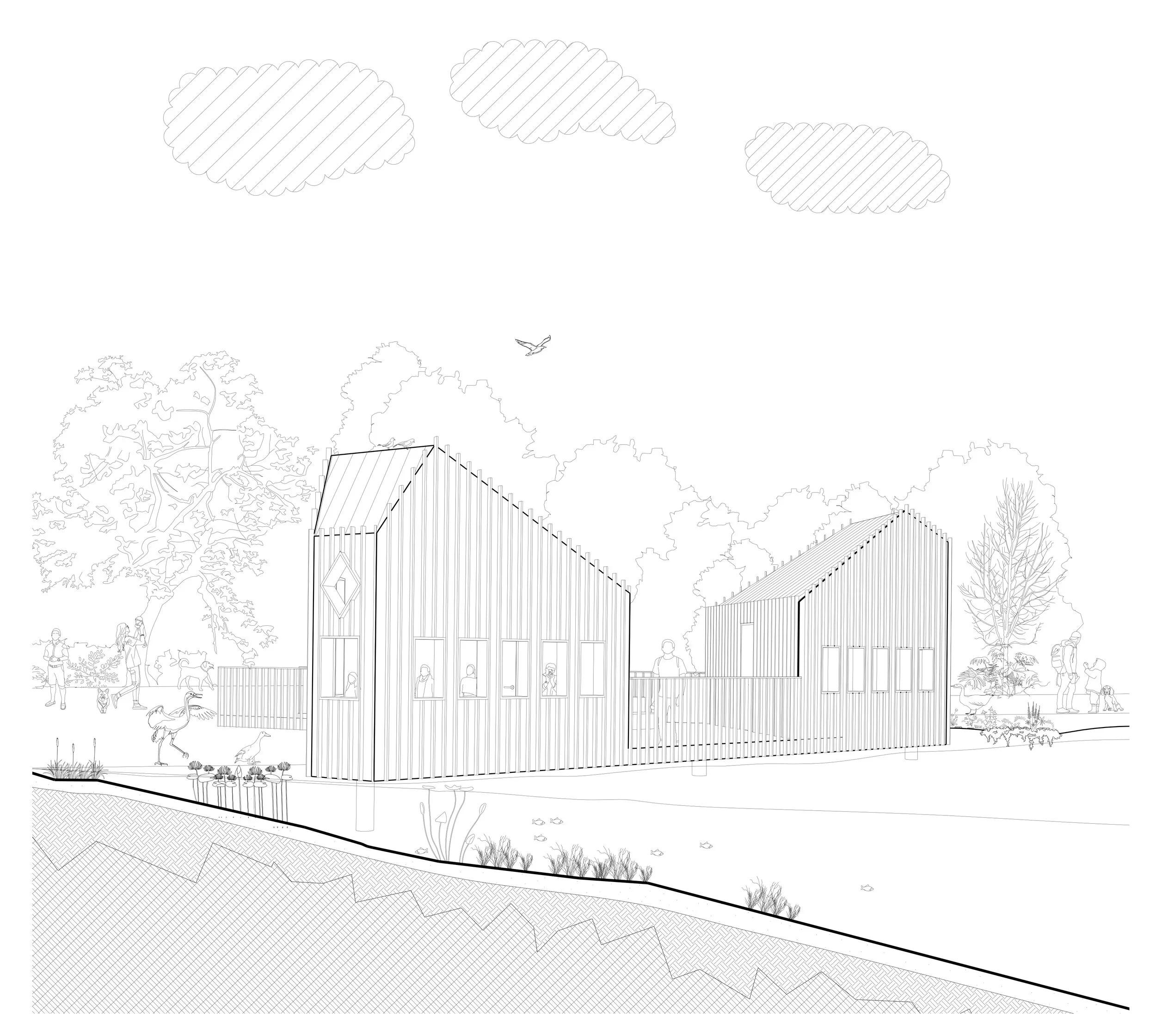 Commissioned by a local charity, this playful bird hide offers a unique, immersive experience for visitors to the Three Brooks Nature Reserve. Its design includes two separate viewing platforms that frame the landscape and pond, offering close encounters with wildlife.