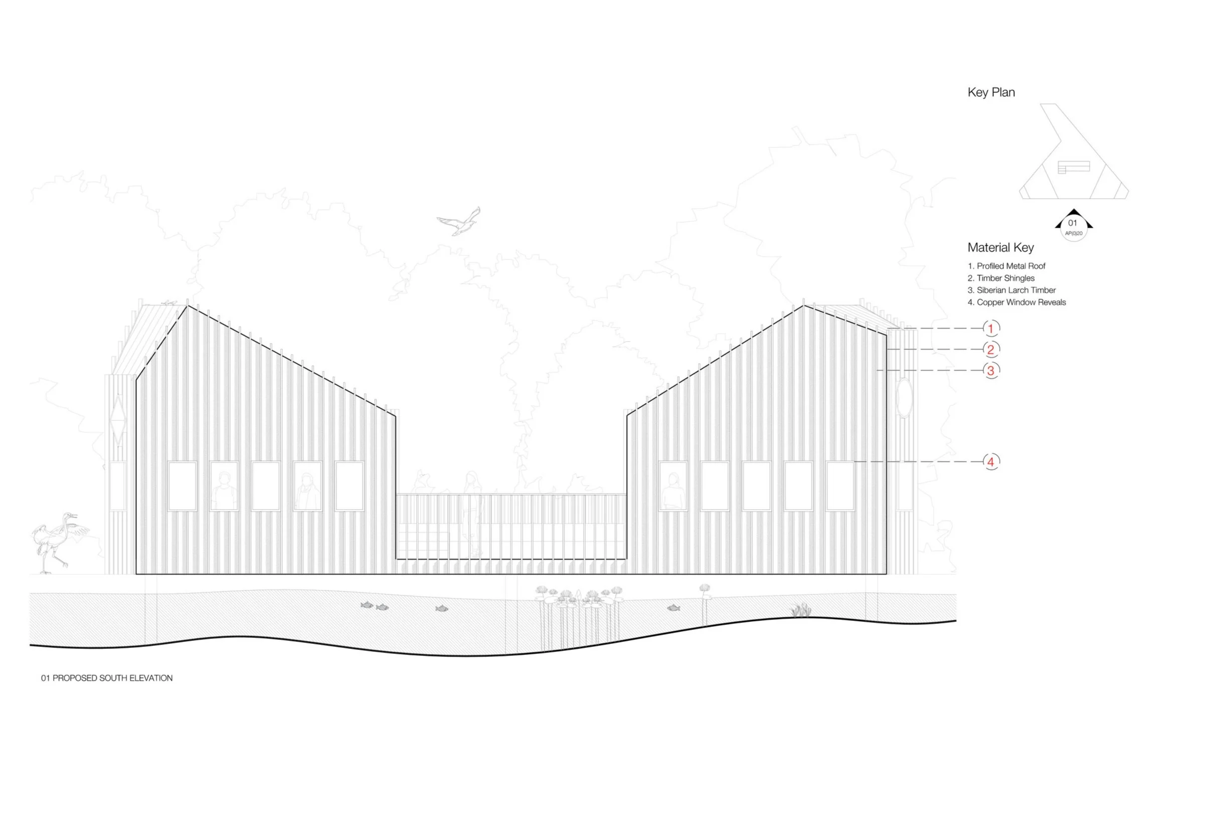 Clad in natural timber and topped with sculptural copper roofs, the hide’s silhouette takes inspiration from birds in flight. The building sits lightly in the landscape and was crafted with low-impact foundations and locally sourced materials.